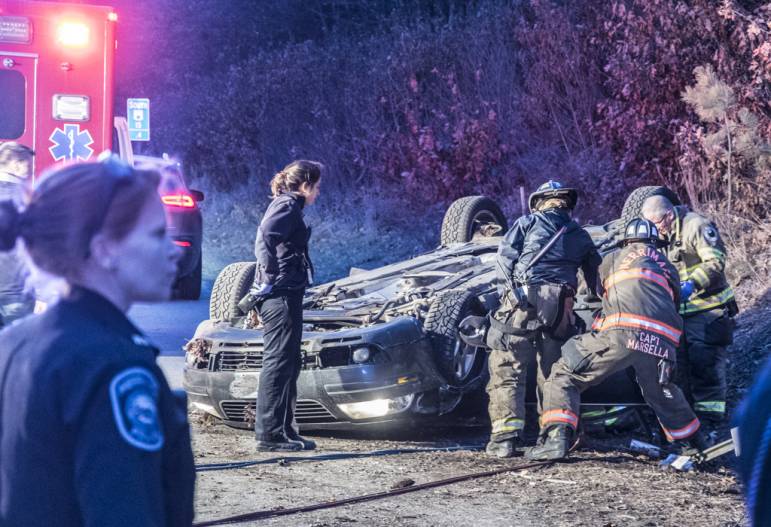 The second vehicle may have struck guardrail in the high-speed lane before veering to the far right and rolling over, trapping the driver. The driver, pinned and unresponsive, was not transported from the scene in what is an apparent fatality.ย Merrimack Fireย and Rescue positioned fire trucks blocking the scene once the highway was reopened.