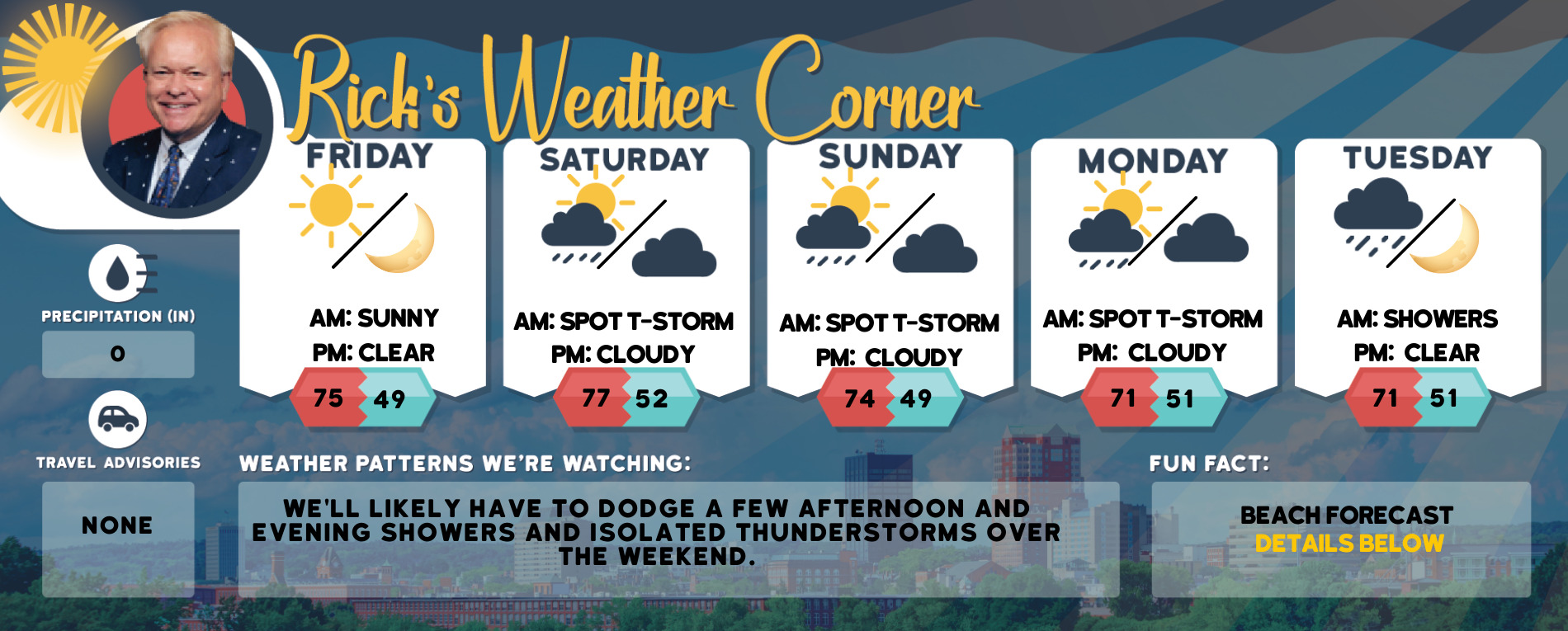 Saturday: Some sun with a spot afternoon thunderstorm High: 77 Winds: WSW 5-10 mph