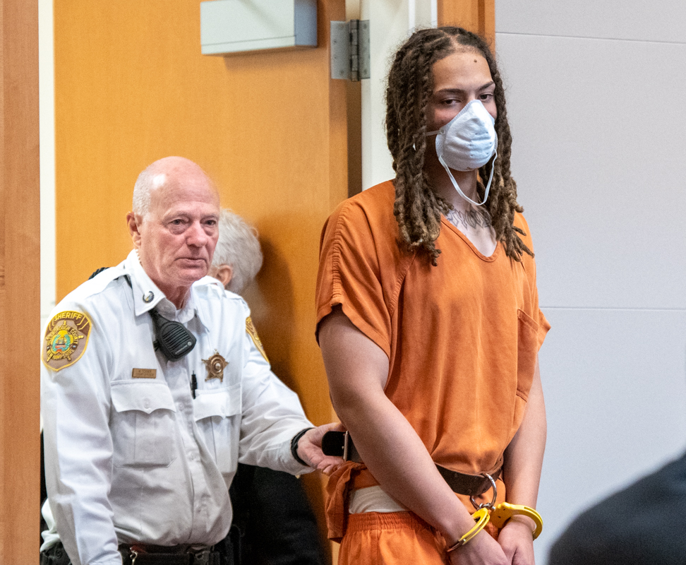 Griffin Oโ€™Neil, accused of being the getaway driver in the May 13 shooting at Elmwood Gardens, being led into court on May 17. According to court documents he was released from prison five days before the Saturday shooting. Photo/Jeffrey Hastings