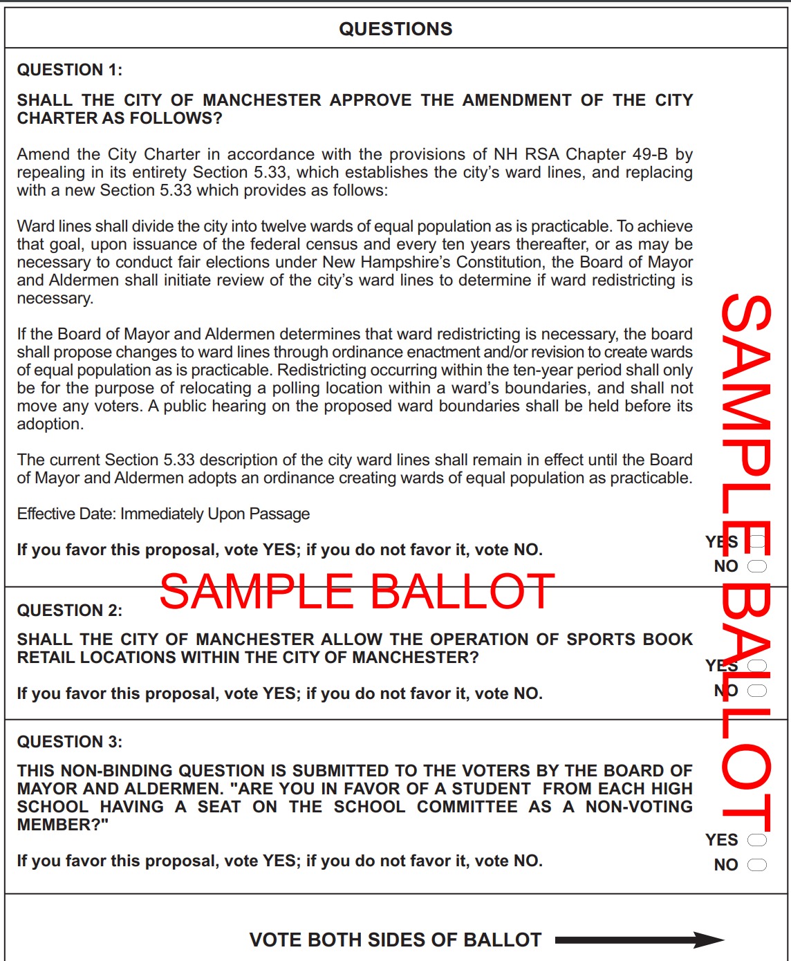 - Manchester is one of nine cities voting Tuesday on whether to allow in-person “sportsbook” betting to be conducted by the NH Lotter.ย Other cities considering the proposal are: Concord, Berlin, Claremont, Dover, Laconia, Nashua, Rochester and Somersworth. A YES vote means you are in favor of allowing sportsbook betting in Manchester establishments.