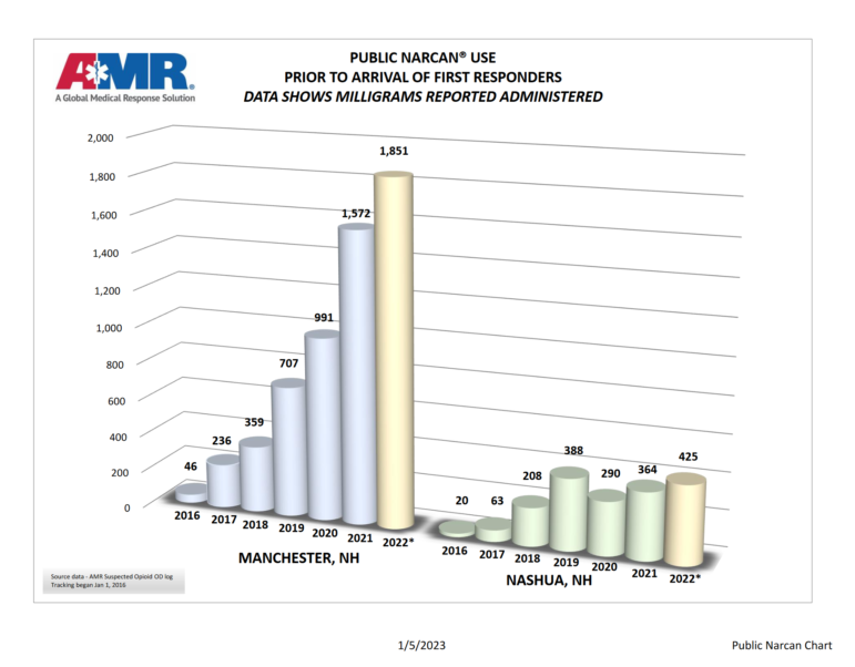 A total of 1,851 milligrams of Narcan was also administered to individuals in Manchester suffering from opioid overdoses prior to the arrival of first responders over the past year, the highest figure since AMR began recording Narcan data.