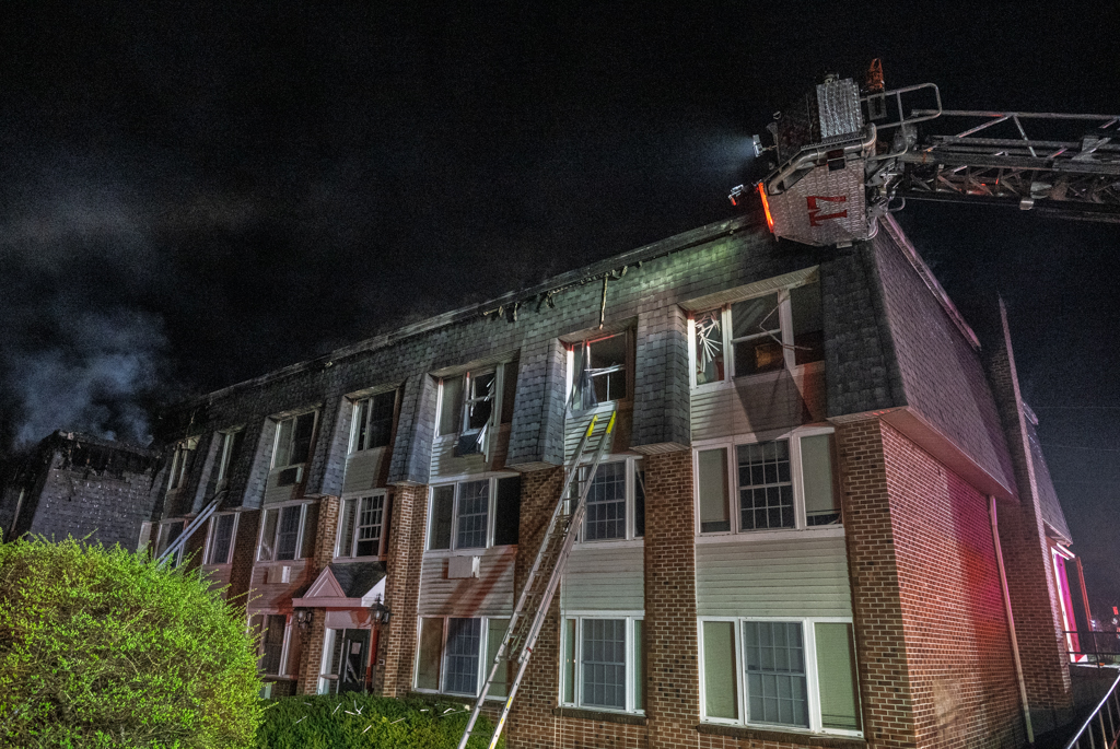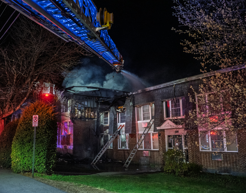 The first units arrivingย reported smoke showing from the rear of a large residential apartment complex. A โworking fire” was announced and heavy fire was observed coming from a top floor apartment, extending into the roof and attic space.