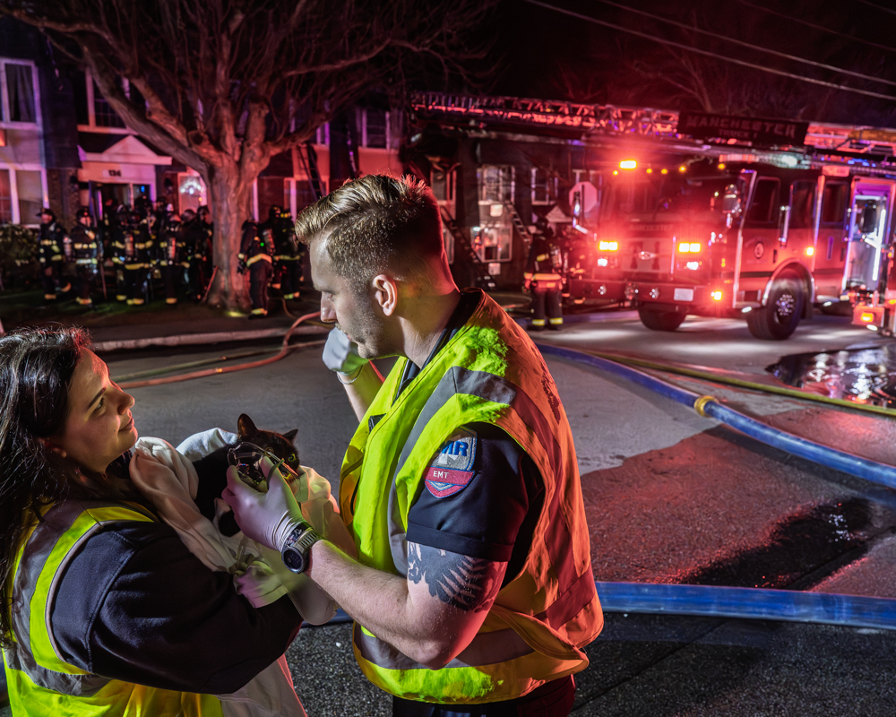 Fire personnel did rescue six cats, according to Manchester Fire Chief Ryan Cashin, one of which wasย transported to veterinarian hospital on Brown Avenue for treatment.ย ย All the pets were expected to survive and no occupants or firefighters were injured. Cashin said the buildings are a total loss.