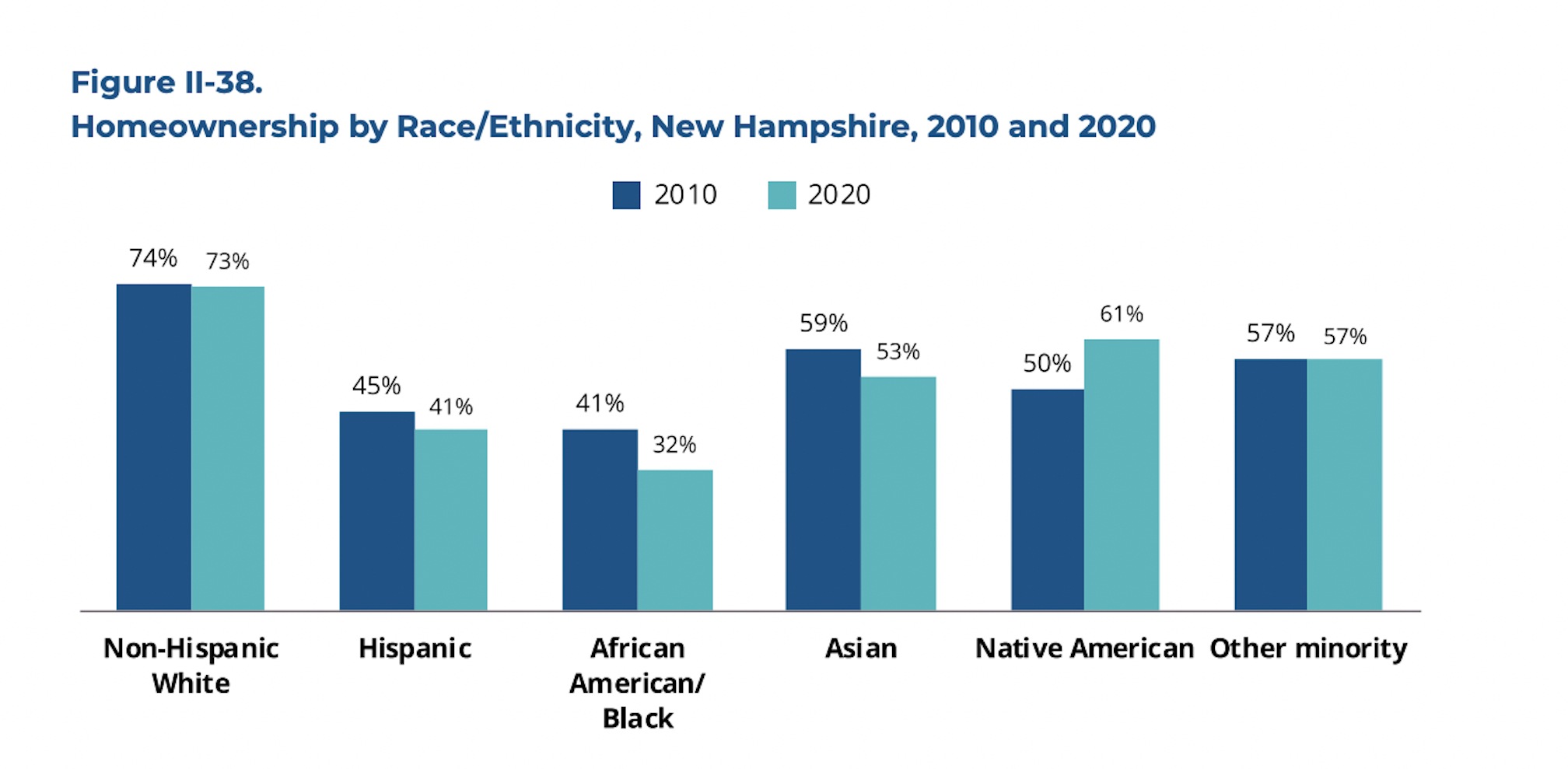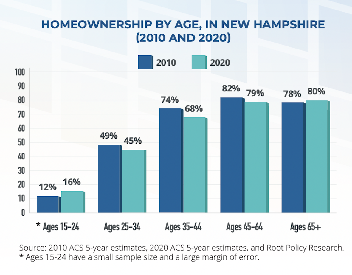 Those identifying as non-Hispanic white saw almost no change: 74 percent of New Hampshire’s white residents owned homes in 2010 and 73 percent of the same demographic owned homes in 2020.