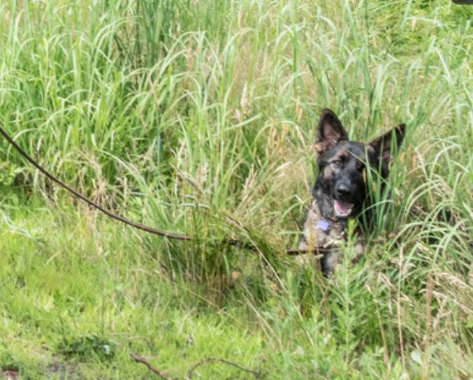 This German shepherd was shaken but not injured in the July 6 rollover accident on I-93. Photo/Jeffrey Hastings