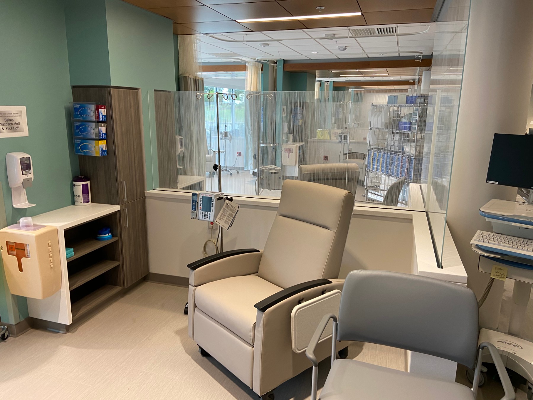 Supported by a staff over about 150, the Center includes small and large features such as pneumatic tubes which can quickly transport information to other parts of the hospital as needed, a dedicated entrance and parking lot (which as anyone who has been to a hospital campus recently knows is a significant factor), lab drawing stations, the ability to order meals, and infusion chairs (there are 14 bays in all) that can be temperature regulated. “Some infusion treatments can take as long as 8 hours,” notes Rafferty. “We try to provide as much comfort as possible.”
