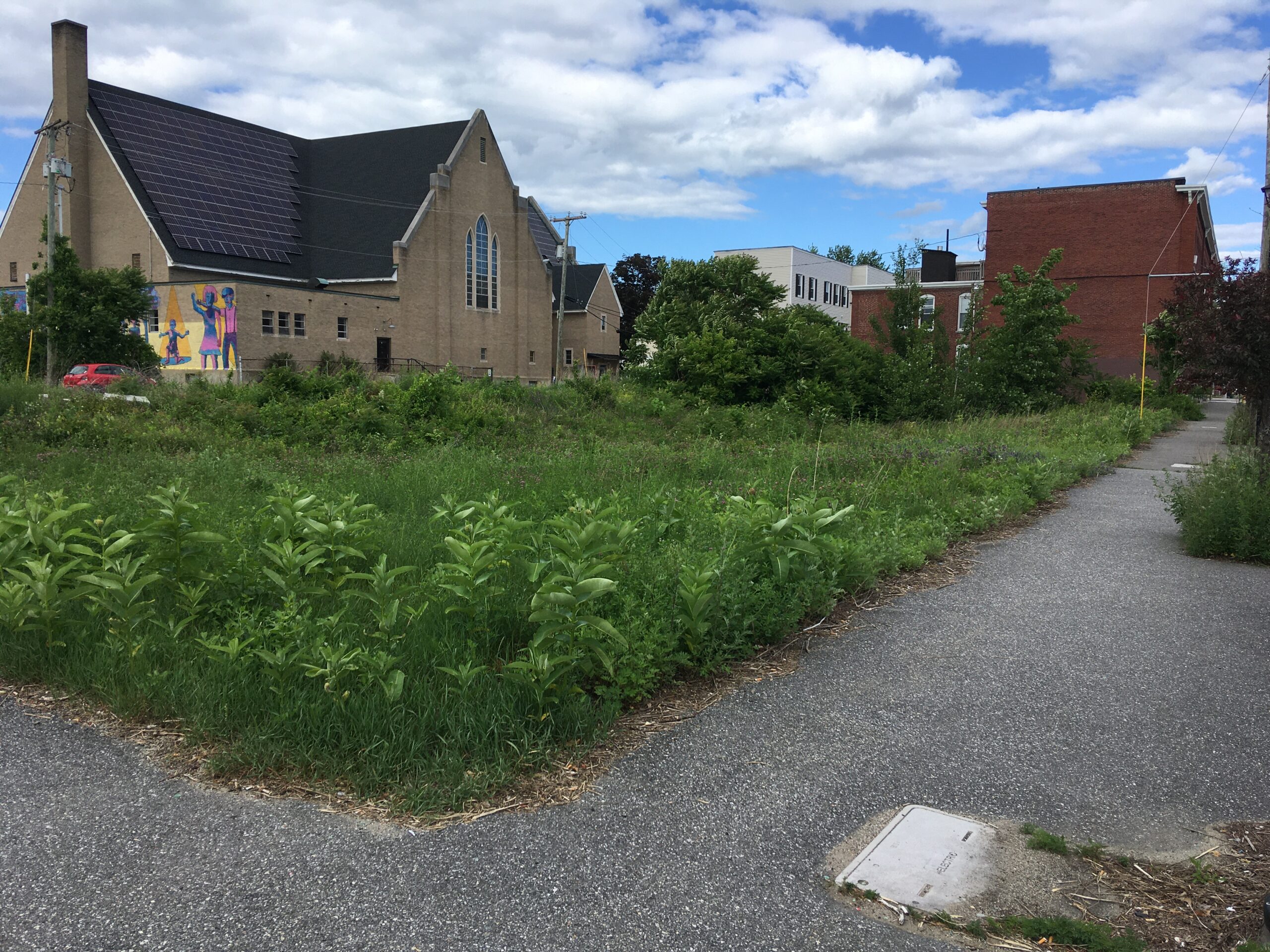 MANCHESTER, NH โ In the summer, the vacant lot on the corner of Chestnut and Pearl streets overflows with biodiversity. Bees bounce from clusters of purple and white clover to pink milkweed blossoms.ย Starlings gather on the branches of small bushes then disperse to nearby electric lines or trees shaded by the brick apartment building next door. The abundant flora hides tossed cigarette packs, gum wrappers and Dunkin Donuts cups that gather in the lot. Discarded cardboard boxes and a dead pine tree, a ghost from a Christmas past, have made the space a final resting place.ย