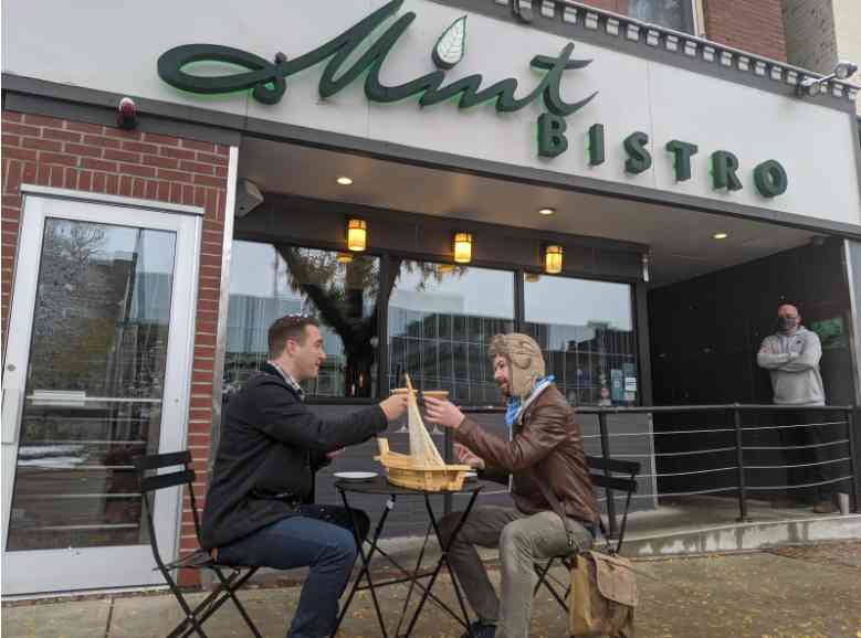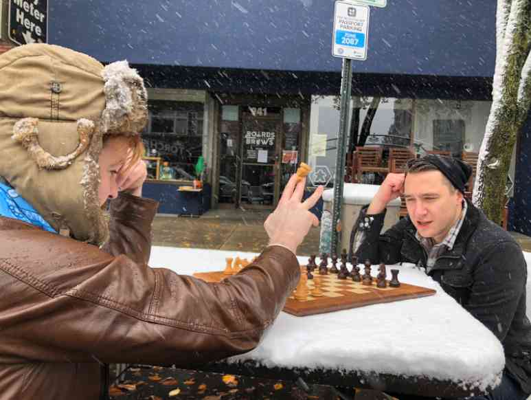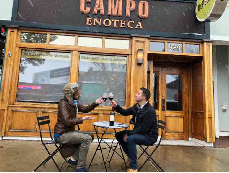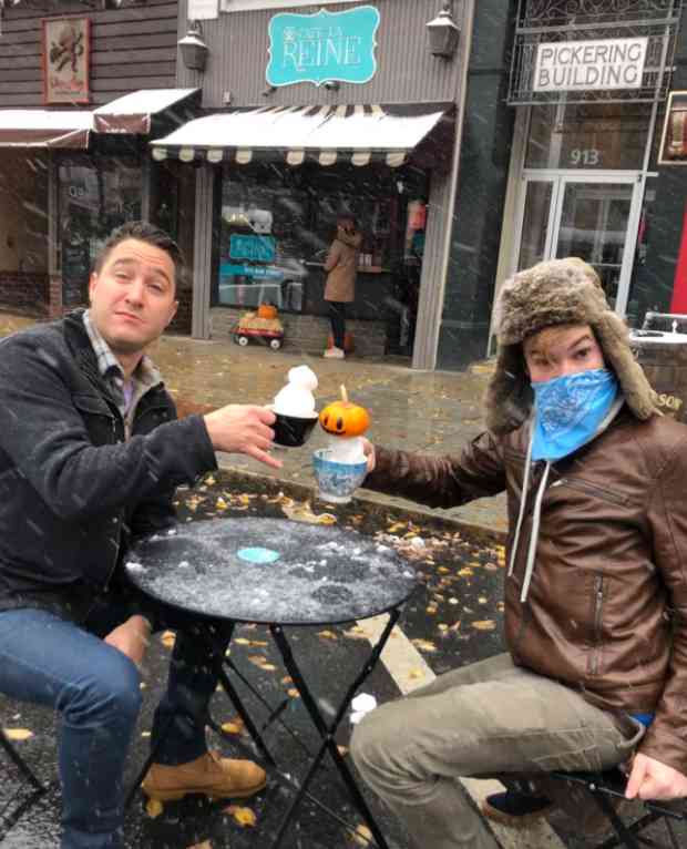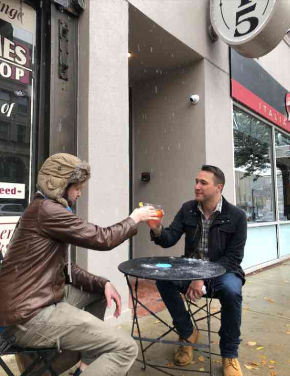 All these conflicting emotions left me not knowing exactly what to do, but feeling like, no matter what, I needed to get outside and spend some time amongst the people and places most important to me. I called up a few friends and was able to convince Boards & Brews’ finest, Fritz Manson (forgive his last name), and 815’s own TJ Rushton to join in the adventure. We grabbed some much-needed coffee at Cafe La Reine, persuaded Richard and Erol to lend us one of their tables (thanks again!), and had an incredible time “dining” in the snow in front of some of downtown’s best spots.