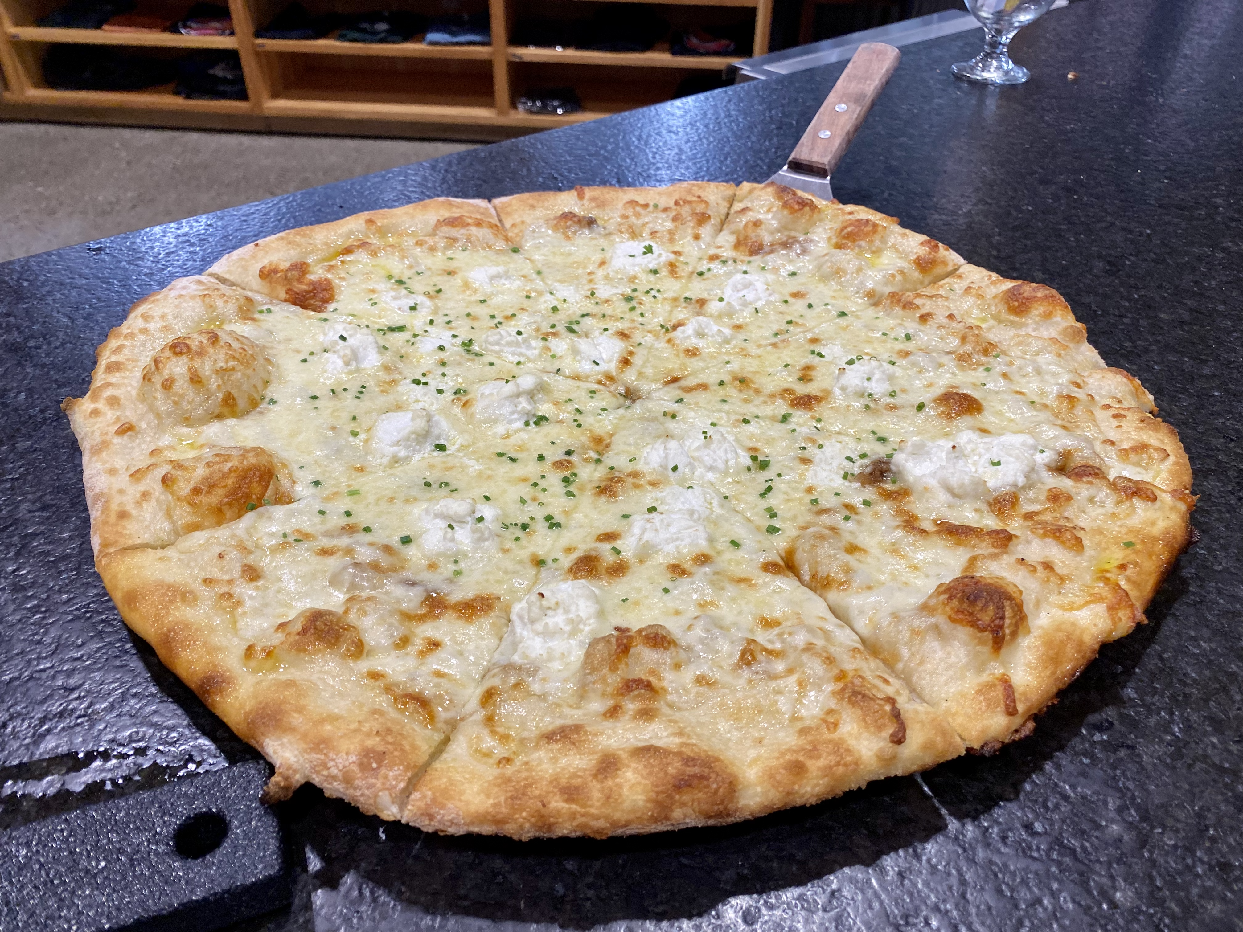 We had two pizzas (’cause you can’t try just one). And holy crap, they’re good-sized, not delicate dainty little things, so we brought plenty home with us (leftovers are always good). They do offer pizzas with half one topping and half another โ in the future we might go that way. I got a veggie pizza (baby spinach, twice baked potato, green pepper, red onion, mushroom, kalamatas, red sauce, mozzarella, provolone) while my wife got a white pizza (black garlic, roasted garlic, olive oil, ricotta, mozzarella, provolone, swiss, garlic butter crust). Both were delicious, I will happily have another slice or two today. Having baked potato on a veggie pizza was a new experience for me, and while it was fine, I can’t say it added much.