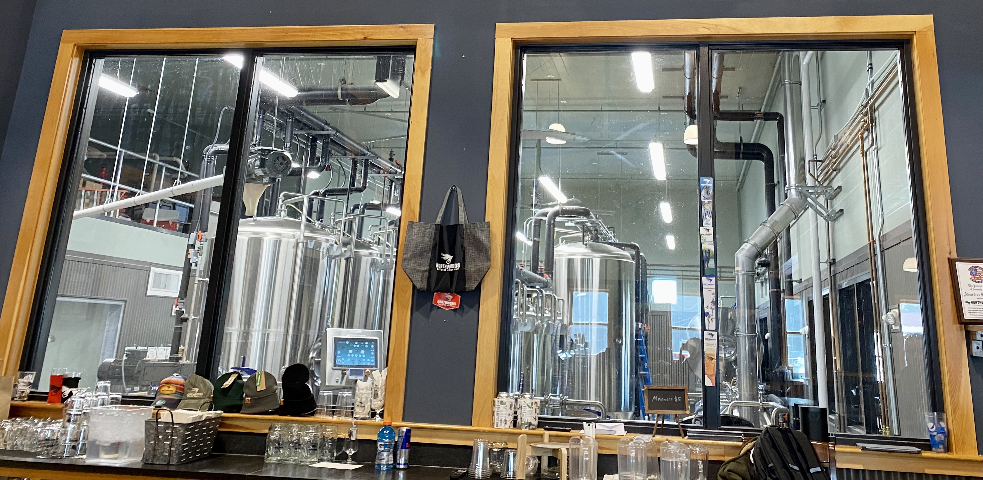 Visiting in early February, there were no tables outside, but from various photos I’ve seen, it looks like in warmer weather they have outdoor seating larger than their indoor space. The indoor space was comfortable and welcoming. Like many such places, the taproom has large glass windows that display the bright shiny tanks of the brewing space.