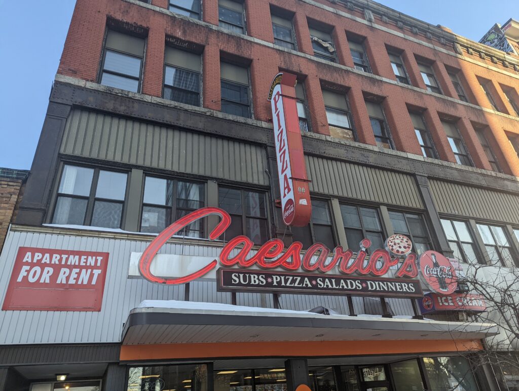 The old Caesario’s sign is just part of the ambiance that its new owners sought to keep. Photo/Andrew Sylvia