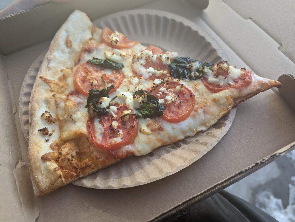 A slice of the Caesario’s pizza, which focuses on tomatoes and feta. Photo/Andrew Sylvia