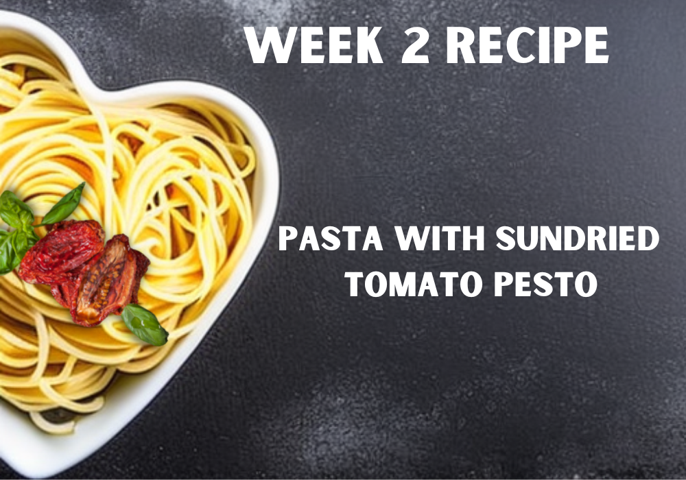 In a blender place the ingredients in this order: 1) olive oil; 2) sundried tomatoes; 3) parmesan cheese; 4) basil leaves; 5) salt and red pepper