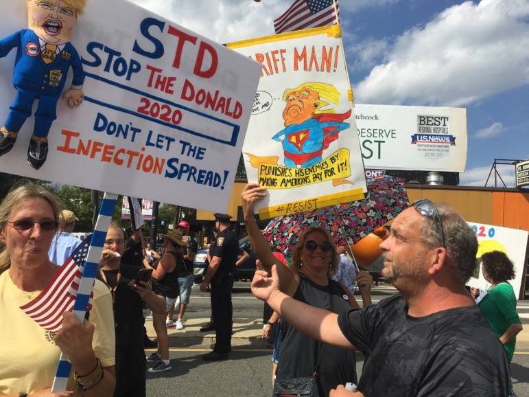 It was rare to see anyone in line without Trump accouterments; generally, those without the Trump identifiers were protesters.ย ย They were positioned on Lake Avenue with a barrier between them and the Trump supporters.ย ย