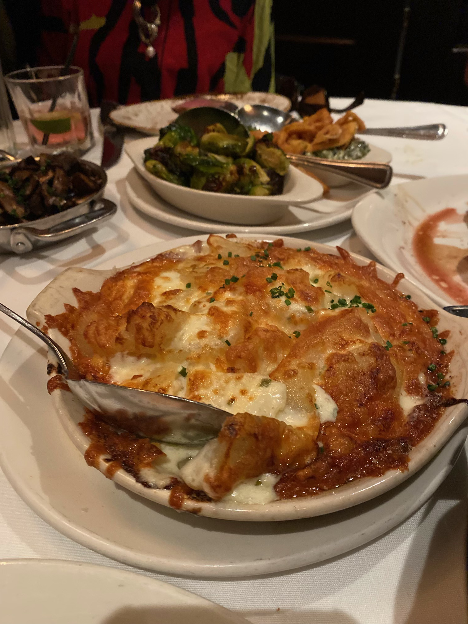 The birthday girl had the 8-ounce grass-fed filet that she said she could cut with her fork. The rest of the group shared two aged Prime Sirloin which the restaurant sliced for us. Being the gluttons that we were, we also ordered sides to go along with the steaks. The nice thing about Abe & Louie’s is that you could order most sides as half orders. We ordered Brussels sprouts, potatoes au gratin with prosciutto and sauteed mushrooms with onions. Everything was delicious and the steaks were cooked perfectly.