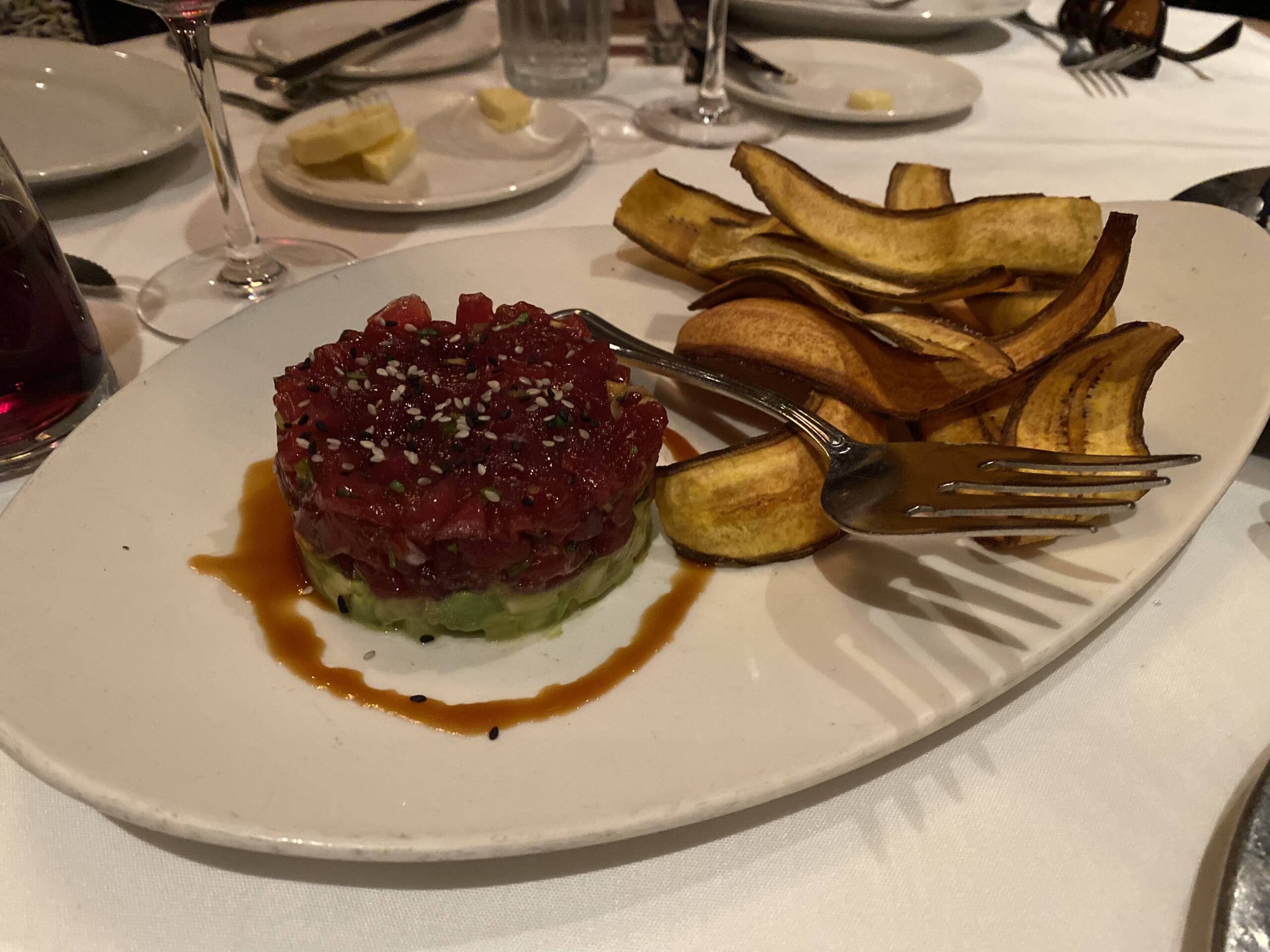 Since we were a party of five, we got to order more appetizers. We started with the shrimp cocktail that were a very nice size and the perfect texture. Next came the ahi tuna tartare with plantain chips. The tuna was of great quality, fresh and delicious. We loved the plantain chips and even requested more.