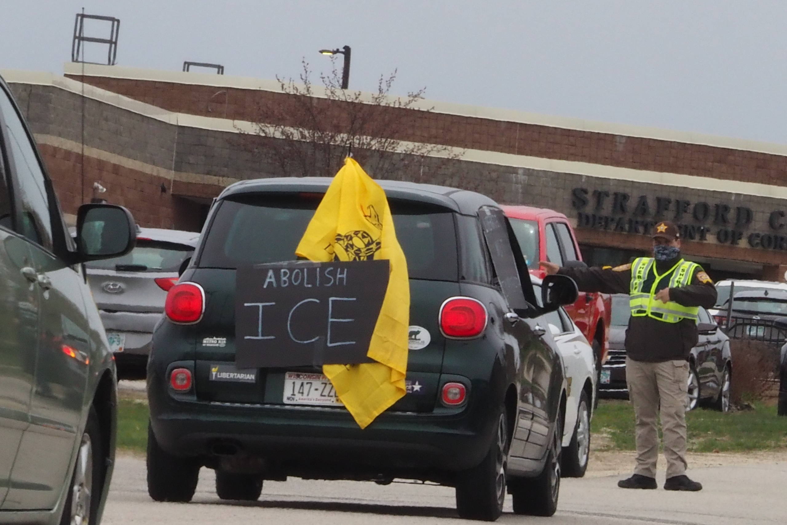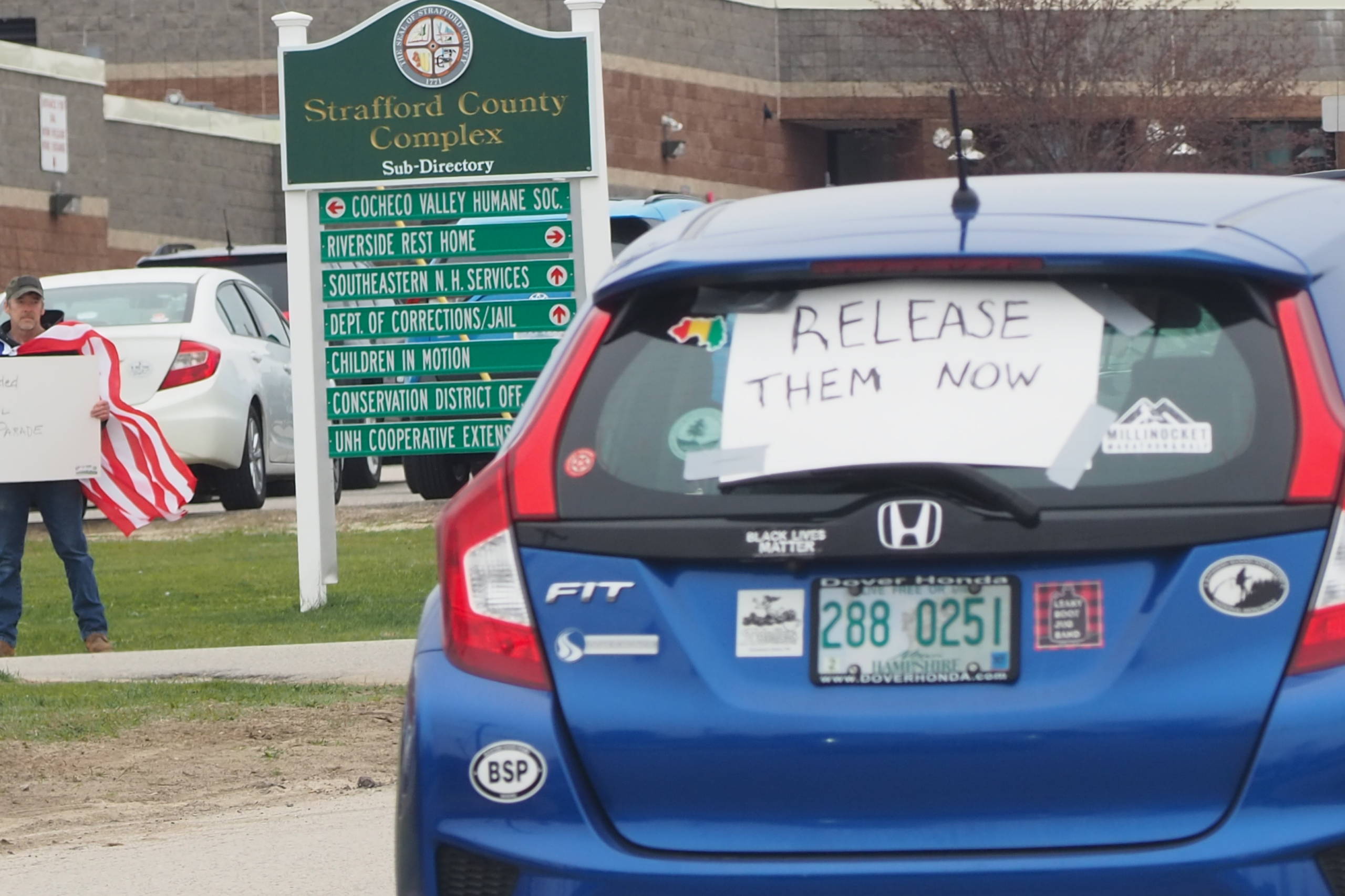 DOVER, NH – For the third time in three weeks, activists staged a car rally protest at the Strafford County NH Corrections House of Detention in Dover, New Hampshire. This Sunday’s rally had the same message as the first two: “ICE must release all civilly-detained immigrants now to prevent the spread of COVID-19 in the jail and in the wider community.”