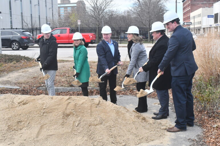 The first shovels of dirt are dug at the corner of Merrimack and Chestnut Streets. Photo/Andrew Sylvia