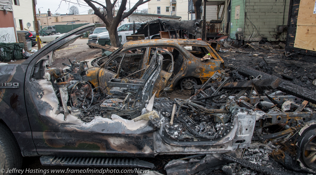 Multiple vehicles surrounding the fire were damaged by fire, smoke or falling debris.