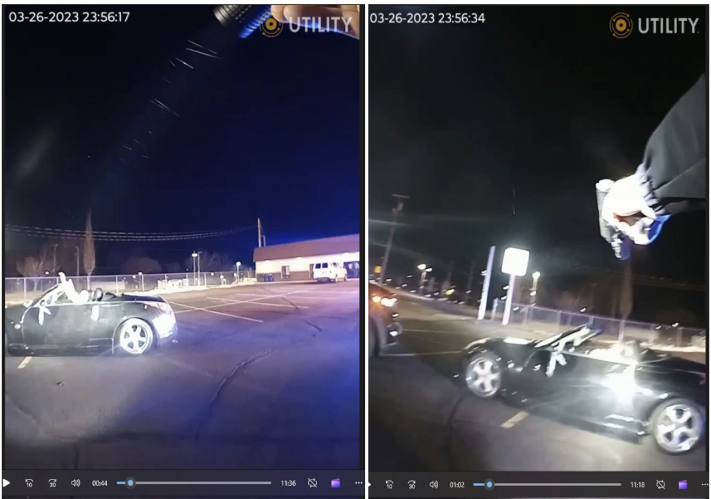 hands raised high over the top of the windshield and seconds later at 11:56:34 P.M. depicting Mr. Al Thuwayni turning away from Sgt. Feather, toward the center console as he reached for his replica Sig Sauer P226 pellet pistol.