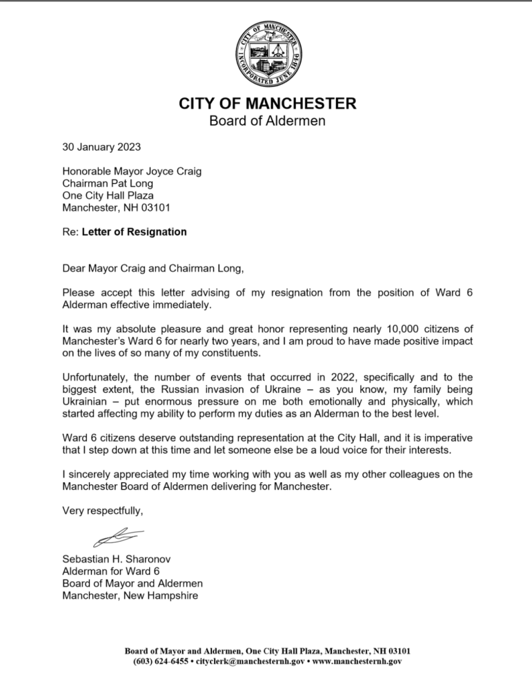 MANCHESTER, NH – On Monday, Ward 6 Alderman Sebastian Sharonov announced his resignation from the Manchester Board of Mayor and Aldermen.