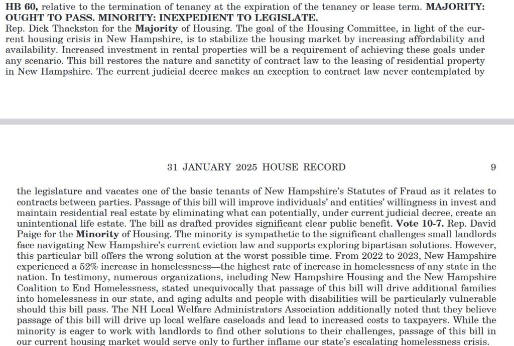 HB 60 received a 10-7 Ought-to-Pass recommendation from the New Hampshire House of Representatives Housing Committee last month and goes before the entire House of Representatives as the sixth scheduled item in the chamberโ€™s regular calendar on Thursday. If the House consents to the recommendation on Thursday, the bill would next head to the New Hampshire Senate this spring.