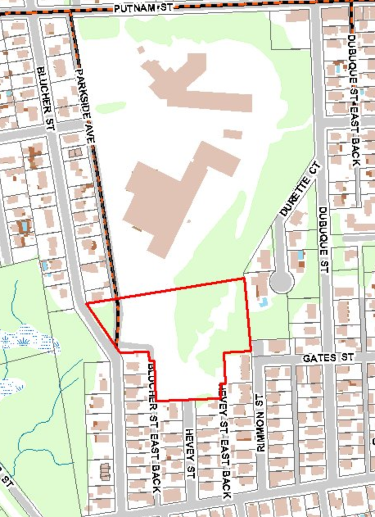 The proposed parcel outlined in red, just south of Parkside Middle School. Screenshot/City of Manchester GIS