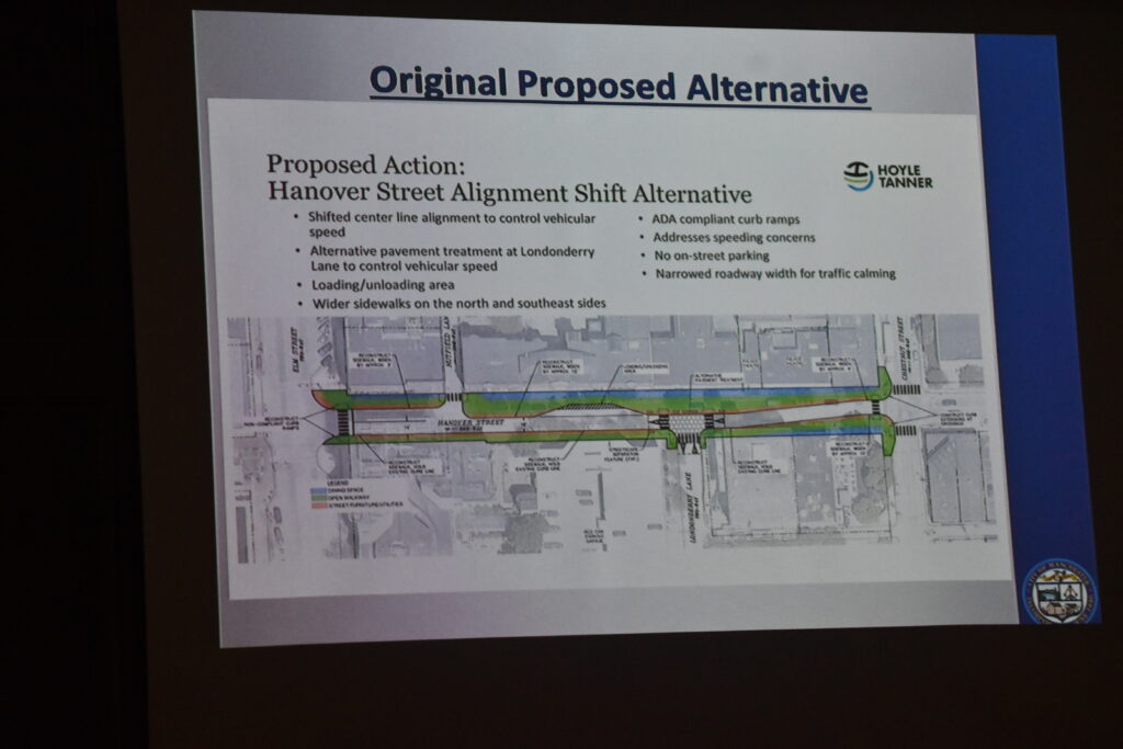 Within the proposal, the layout of Hanover Street from Chestnut Street to Elm Street, currently at three lanes, would become a “sliding” one lane street that would create enlarged sidewalks jutting into the street in certain areas and creating enlarged sidewalk bumpouts and specified pick-up/drop-off areas.