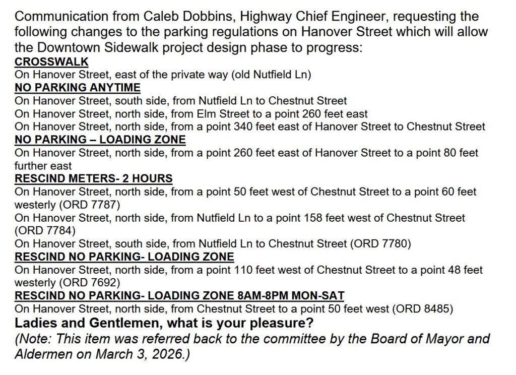 A special meeting of the Manchester Board of Mayor and Aldermen’s Committee on Public Safety, Traffic and Health a day earlier recommended the changes, triggered by the opportunity of federal funding for downtown infrastructure improvements and refined during public input sessions in April, August and November of 2025 as well as meetings with the downtown business community before concerns were raised in February that put a halt on the proposal’s potential approval.