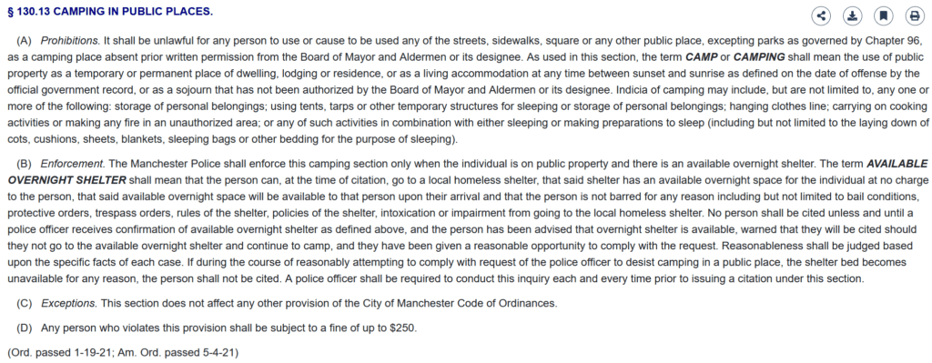 The change came in part to the U.S. Supreme Courtโs ruling overturning and remanding City of Grants Pass, Oregon v. Johnson that had claimed anti-camping ordinances by cities constituted cruel and unusual punishment as defined by the 8th Amendment to the U.S. Constitution. That ruling abrogated the 2018 U.S. Court of Appeals for the Ninth Circuit case Martin v. Boise, which had been at the heart of Part Bโs purpose in Manchesterโs Section 130.13 when it was created.
