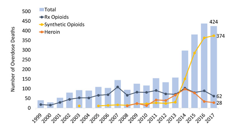 NH Overdose Deaths 1999-2017 Graphic/NH DHHS