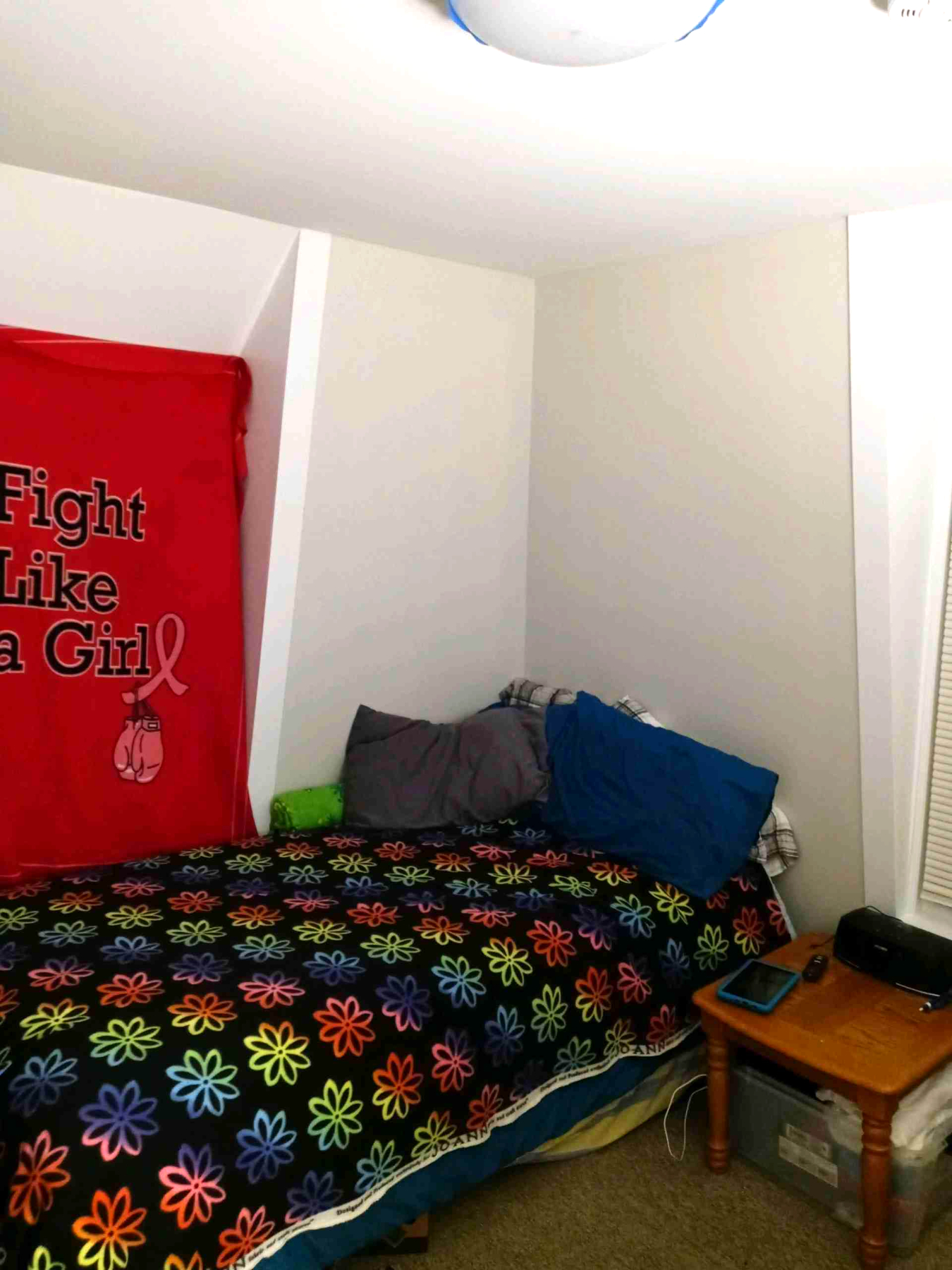 “Everyone is drinking there. Not inside, but before they go in. We’d be doing the same thing. The last time we stayed there we got head lice and had to cut off our hair. Here the rules are easy to follow. We are together. We help each other. We have our own room, and it inspires me to keep going, to reach all my goals,” she says.