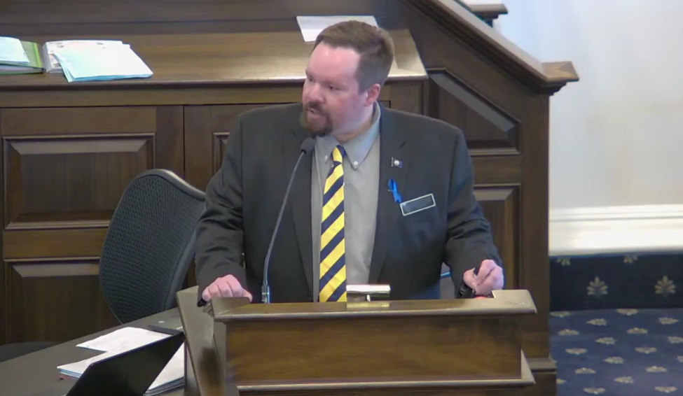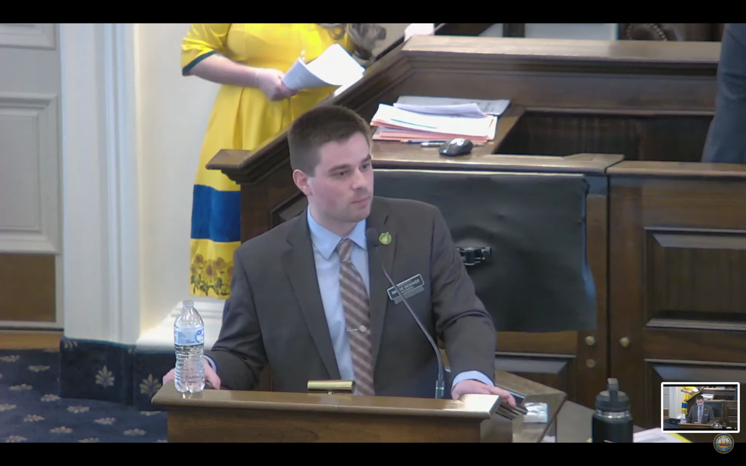 Rep. Brodie Deshaies, R-Wolfeboro, arguing to kill CACR 32 at Thursday’s House session. Screenshot (his remarks being at 4:27:56 in YouTube video below)