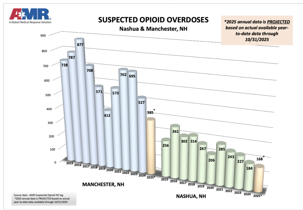 AMR medics responded to a total of 35 suspected opioid ODs in Nashua and Manchester during October 2025. 17 occurred in Manchester and 18 occurred in Nashua.