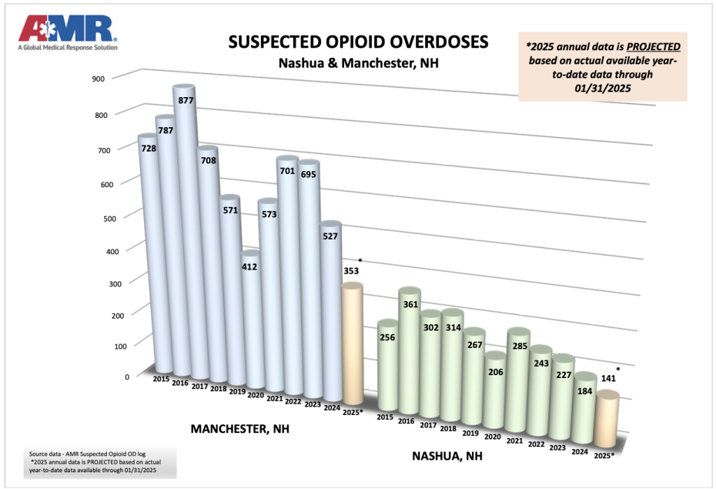 AMR medics responded to a total of 42 suspected opioid ODs in Nashua and Manchester during January 2025. 30 in Manchester and 12 in Nashua.