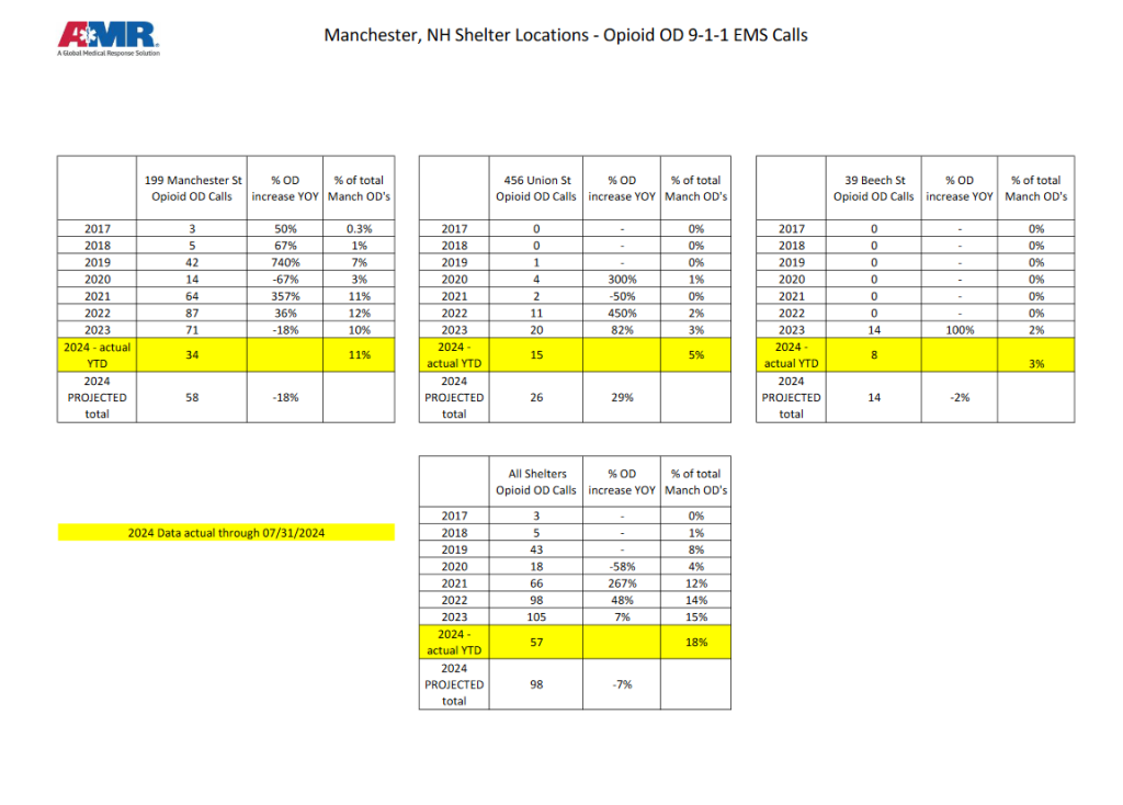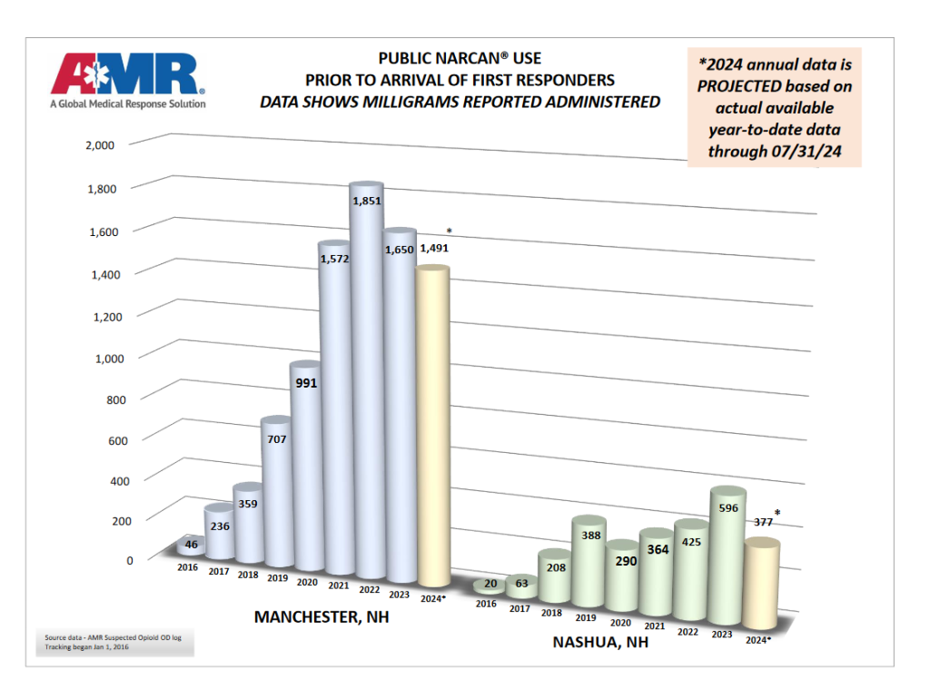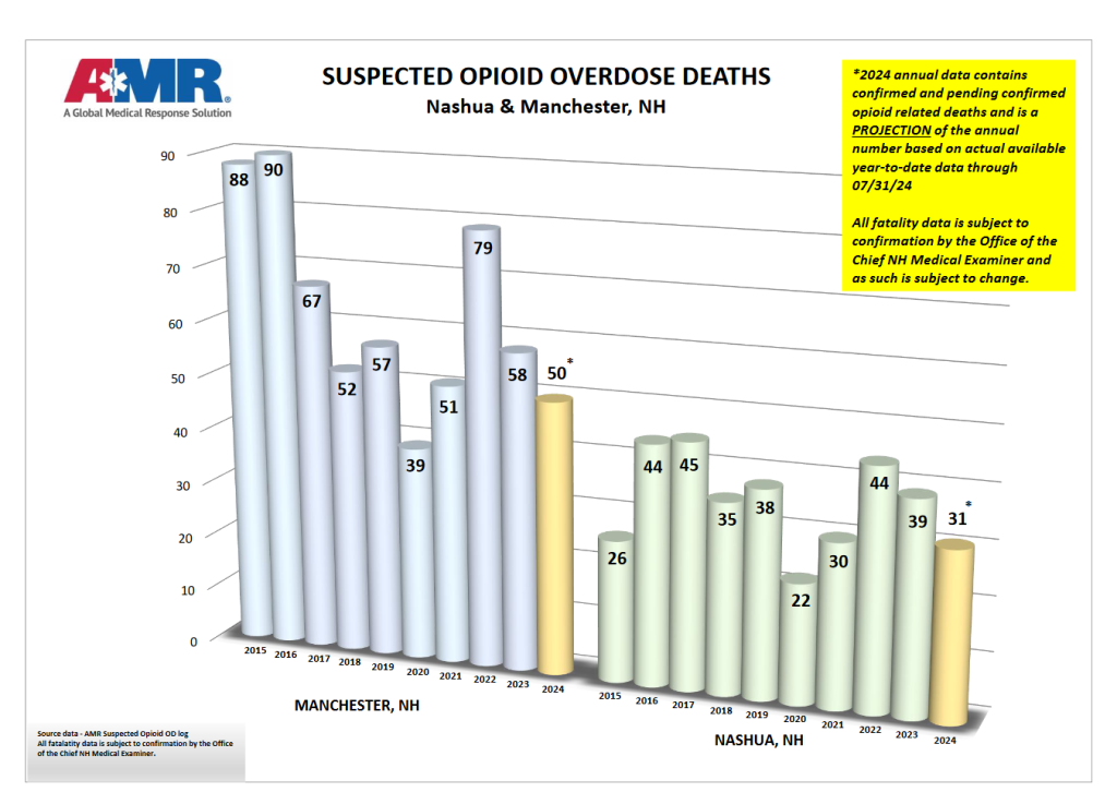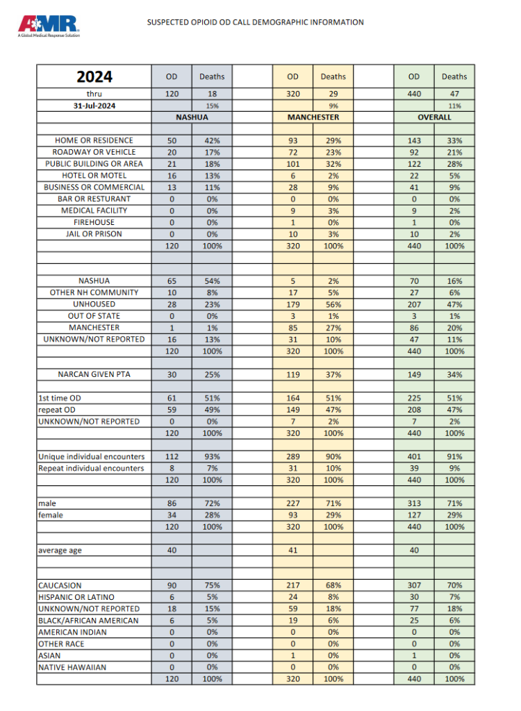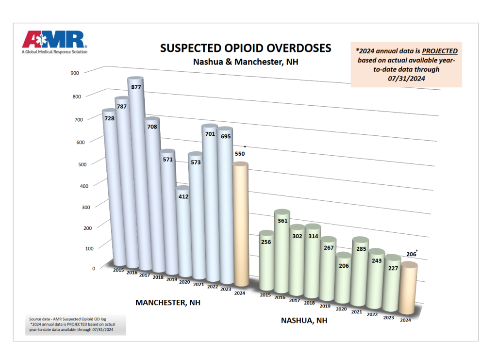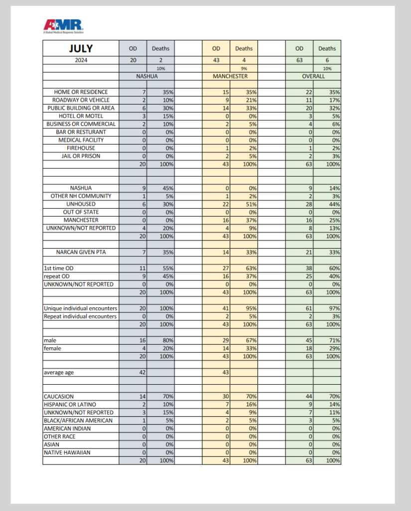 MANCHESTER, N.H. – This week, American Medical Rescue (AMR) released suspected opioid statistics for Manchester and Nashua during July 2024.