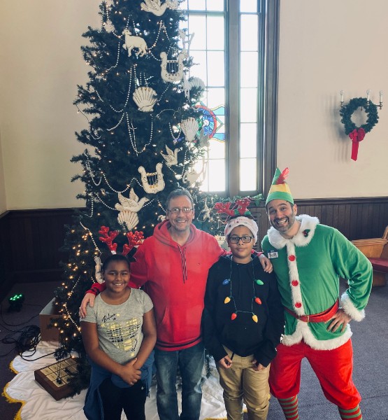 From left, Rosie Pena Ramirez, 9, Henry Demers, founder and president of Harmony Home Ministry, Janvel Pena Ramirez, 11, and Thomas Carter (Buddy the Elf) have some fun at the Merry Christmas 2019 event. Photo/Pat Grossmith