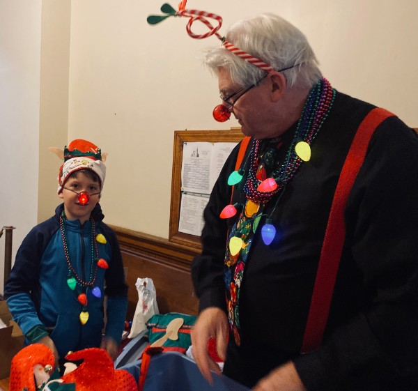 Nine-year-old Adrien Furnanz helps Allard Deu distribute festive Santa hats and string-of-lights necklaces at Saturdayโ€™s Merry Christmas 2019 event sponsored by Harmony Home Ministry at the First Baptist Church. Photo/Pat Grossmith