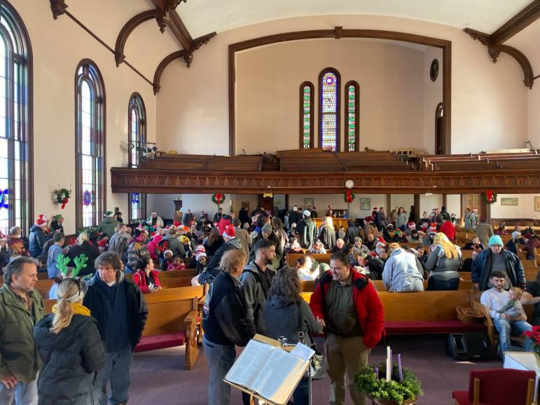 First up, though, was an hour-long Christmas service, followed by the selection of Santa hats, some with blinking lights, and necklaces, some beaded, some a string of Christmas lights, adding a festive touch to the event.