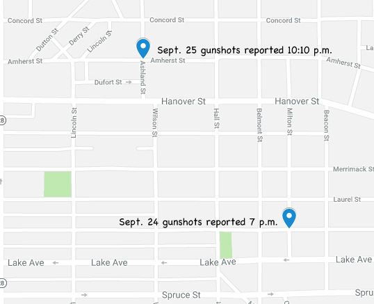 On Sept. 25 at approximately 10:10 pm, Manchester Police responded to the area of Amherst and Ashland streets for the report of multiple gunshots. Officers located multiple casings in the area, which after further investigation, were found to be blank shell casings, in front of 393 Amherst St., and conducted a canvas of the area but were unable to locate any victims or property damage.