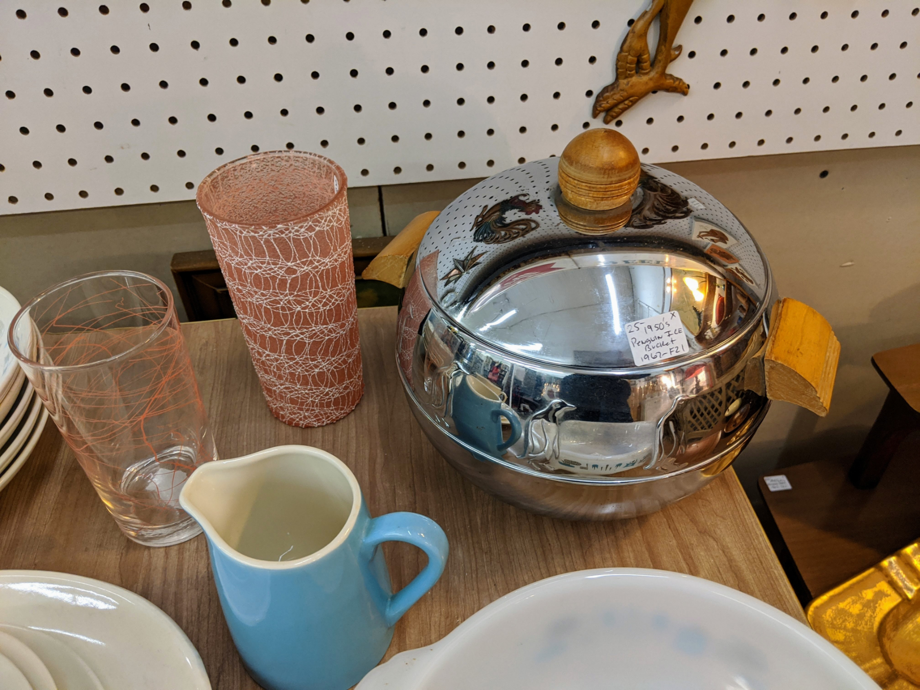 Talk about flashbacks โ I spot a familar Barbie case from my childhood, circa 1965. There’s a dome-shaped metal ice bucket embossed with penguins, an exact replica of one my parents owned, sitting on a table next to a glass with swirly vinyl that looks just like one from my 1970s kitchen. It’s easy to get lost in the nostalgia – from Golden Books and McCall’s dress patterns to rotary telephones, old radios, costume jewelry and abandoned old photographs.