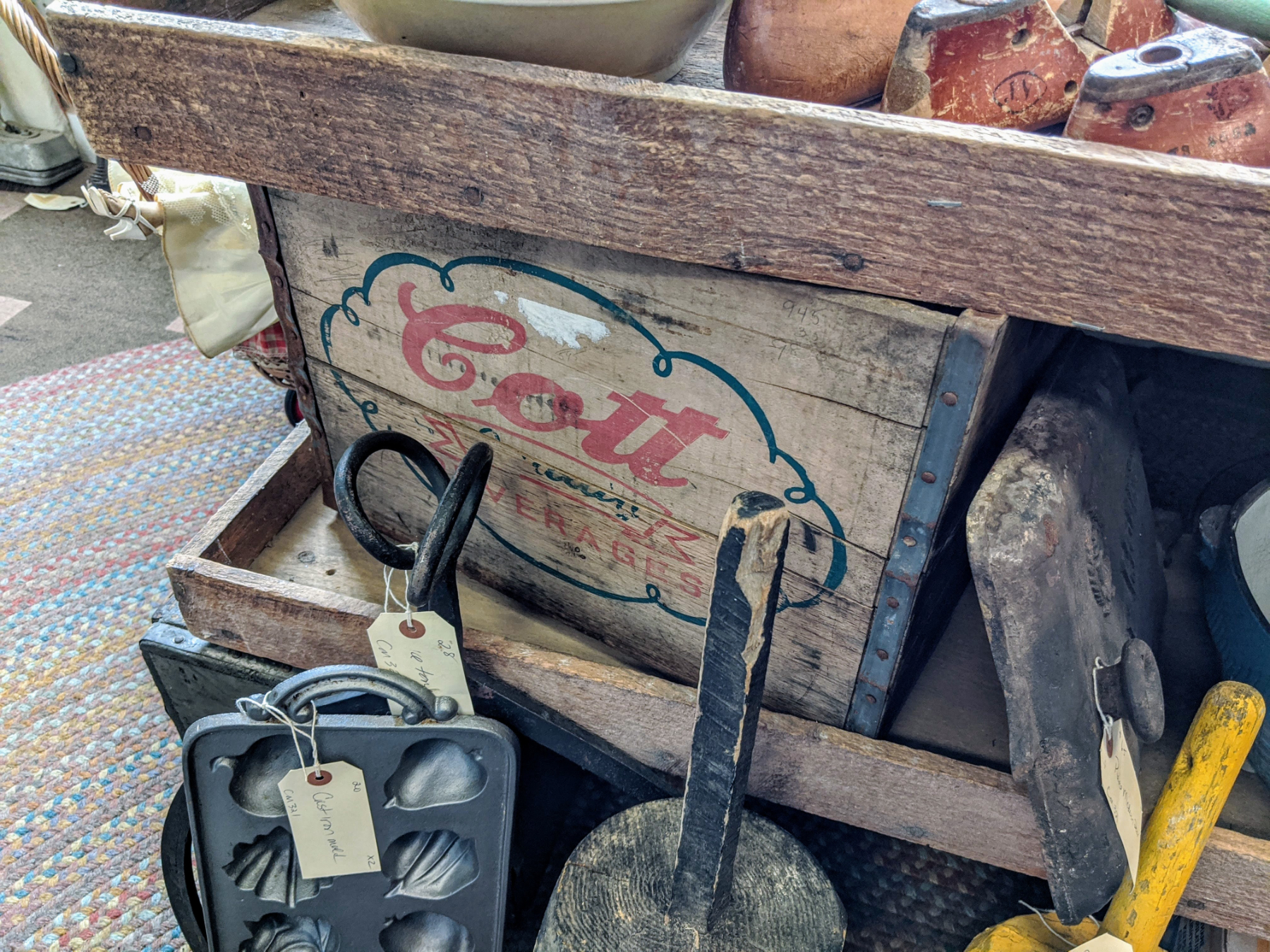 Jones knows George loves the old wooden soda crates from the former Cotts bottling plant in Manchester, and points to one that’s part of the front window display.
