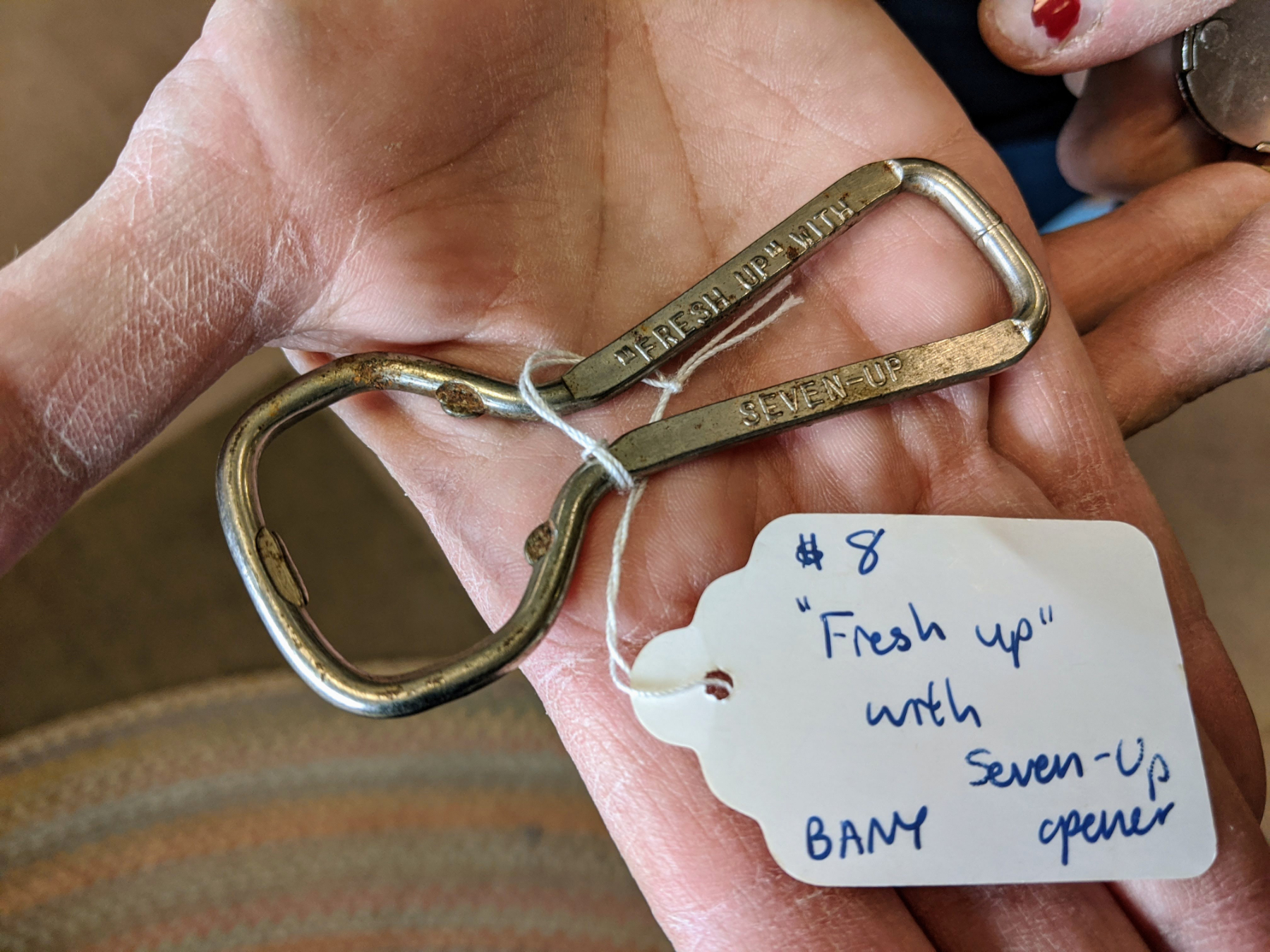 “I only get the ones I don’t already have,” says Theresa, holding up a simple-looking metal 7-Up bottle-opener that has caught her eye.