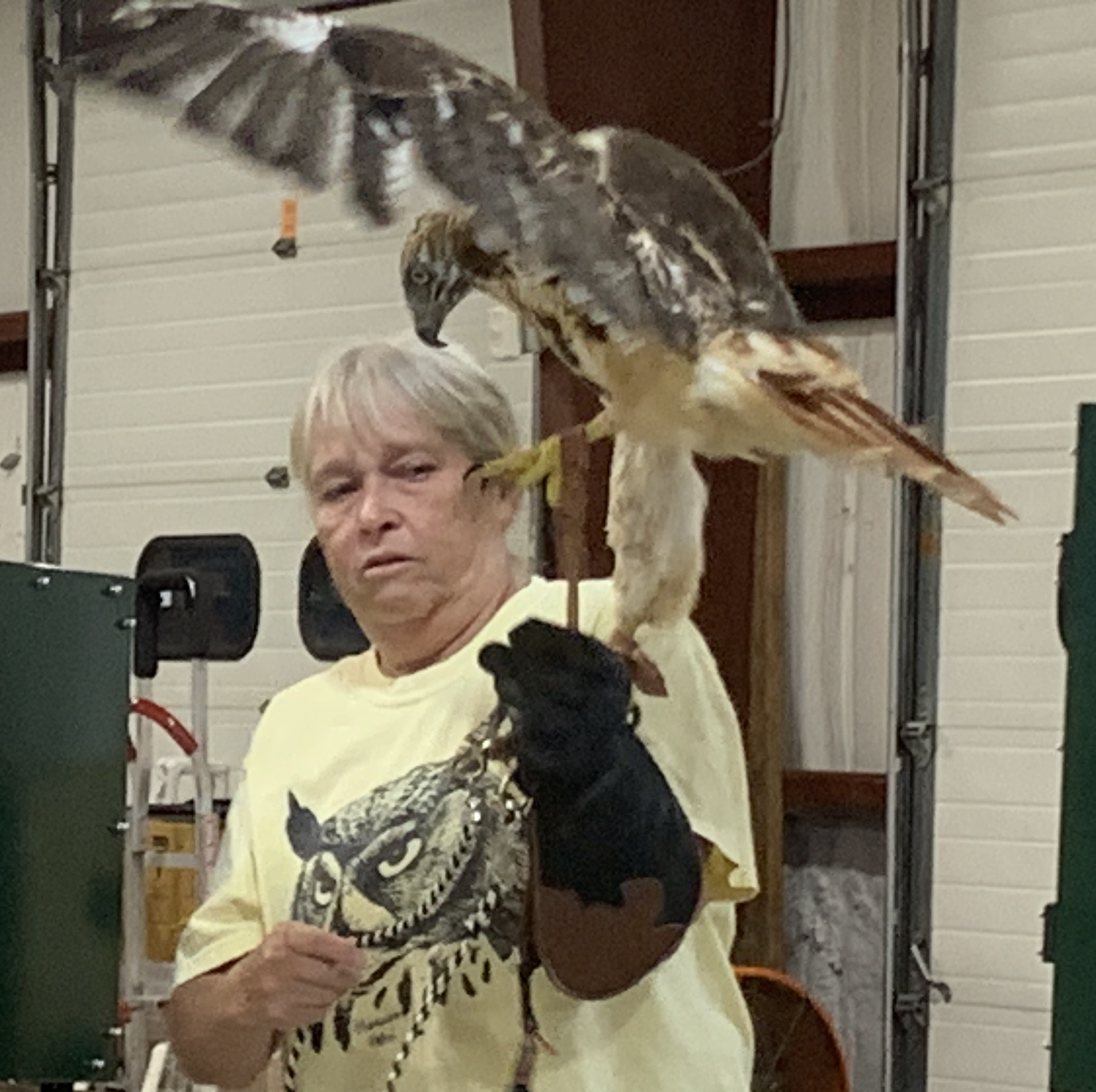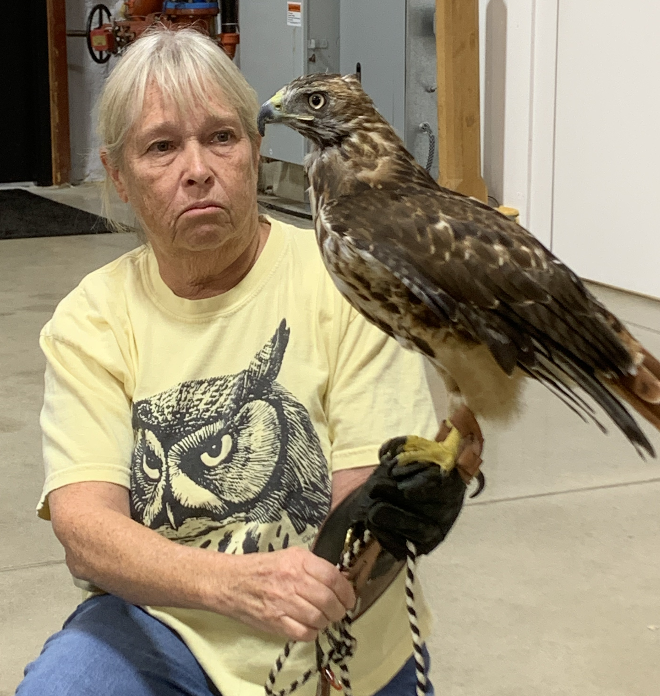 Next to emerge from a cage was Phoenix the red-tailed hawk. Phoenix came to Tailwinds while still young, and at that time had no tail. They believe this was due to an infection of West Nile virus. But today, Phoenix sports a healthy red tail. When just out of the cage, settling onto the gloved arm of Linda, Phoenix got a little rambunctious, but then settled down.