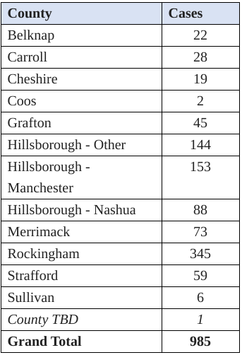 CONCORD, NH — On Sunday, April 12, 2020, DHHS announced 57 new positive test results for COVID-19. There have now been 985 cases of COVID-19 diagnosed in New Hampshire.