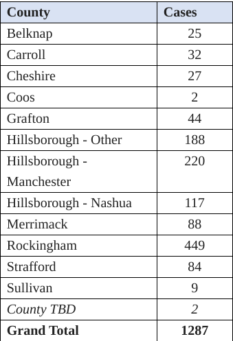 CONCORD, NH โ€” On Friday, April 17, 2020, DHHS announced 78 new positive test results for COVID-19. There have now been 1,287 cases of COVID-19 diagnosed in New Hampshire. Several cases are still under investigation.