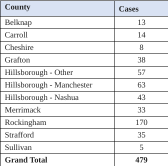 The new cases are 42 adult females and 22 adult males. The new cases reside in Rockingham (17), Hillsborough County other than Manchester and Nashua (12), Strafford (6), Merrimack (4), Cheshire (1), Grafton (1), and Sullivan (1) counties, and in the cities of Manchester (19) and Nashua (3). Ten of the new cases were hospitalized for their illness; thus far, 73 (15%) of the 479 positive cases have been hospitalized. Thirty-seven of the new cases have no identified risk factors. Community-based transmission continues to increase in the State and has been identified in all counties with cases. Most of the remaining cases have either had travel to domestic or international locations or have had close contact with a person with a confirmed COVID-19 diagnosis.