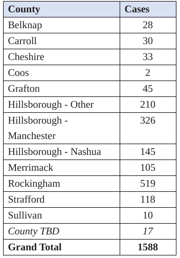 CONCORD,ย NH โ On Wednesday, April 22, 2020, DHHS announced 99 new positive test results for COVID-19. There have now been 1,588 cases of COVID-19 diagnosed in New Hampshire. Several cases are still under investigation. Additional information from ongoing investigations will be incorporated into future COVID-19 updates.