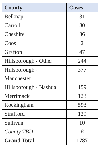 CONCORD, NH โ On Saturday, April 25, 2020, DHHS announced 69 new positive test results for COVID-19. There have now been 1,787 cases of COVID-19 diagnosed in New Hampshire. Several cases are still under investigation. Additional information from ongoing investigations will be incorporated into future COVID-19 updates.