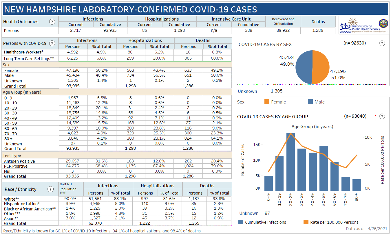 New Hampshire 2019 Novel Coronavirus (COVID-19) Summary Report (updated April 26, 2021, 9 a.m.)